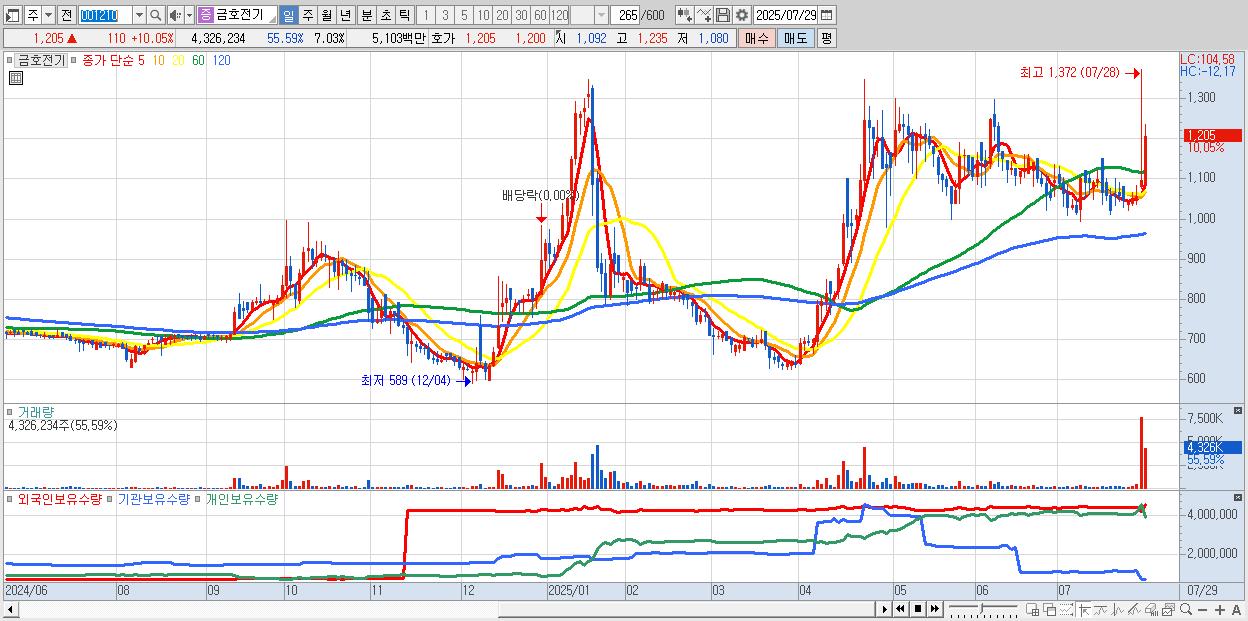 - 금호전기 (1,205원 ▲ 10.05% , 시총: 742억, 거래량: 4,326,234, 거래대금:51억)
