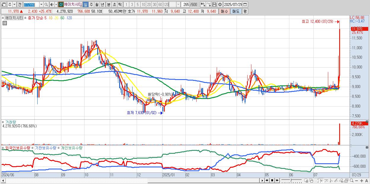 - 에이치시티 (11,970원 ▲ 25.47% , 시총: 882억, 거래량: 4,278,920, 거래대금:505억)