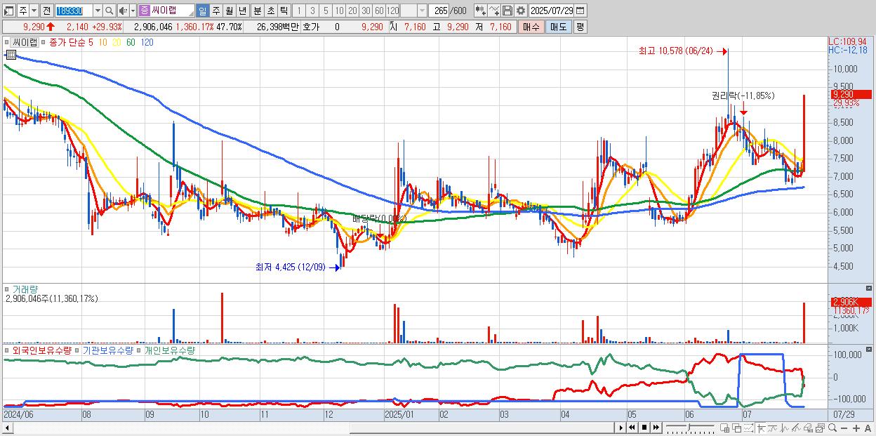 2.씨이랩 9,290원 ▲ 29.93% (KOSDAQ, 189330)