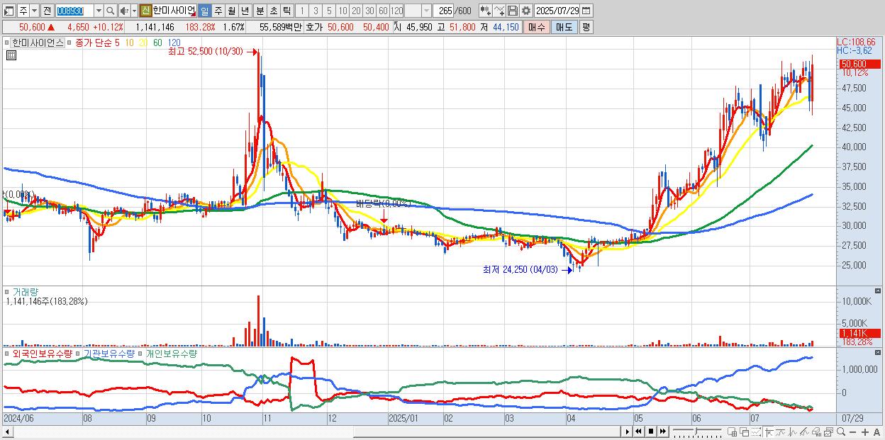 - 한미사이언스 (50,000원 ▲ 8.81% , 시총: 34,196억, 거래량: 768,017, 거래대금:373억)