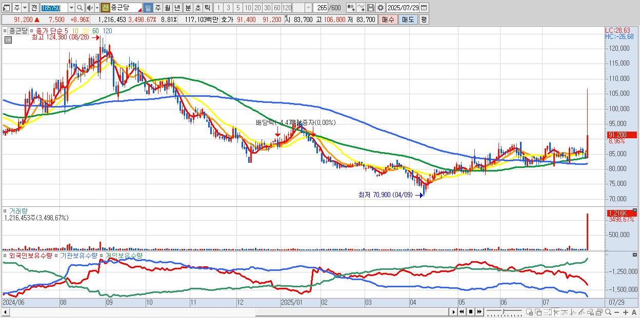 - 종근당 (96,500원 ▲ 15.29% , 시총: 13,320억, 거래량: 555,101, 거래대금:533억)