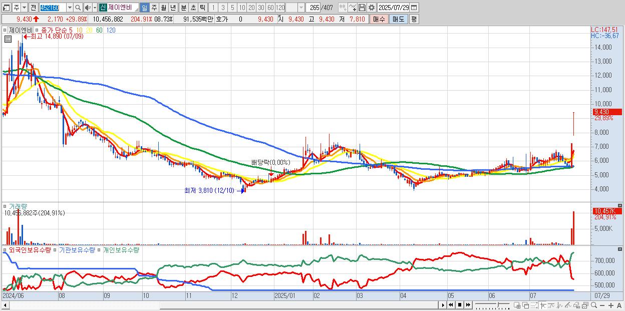 - 제이엔비 (9,430원 ▲ 29.89% , 시총: 907억, 거래량: 10,456,882, 거래대금:915억)