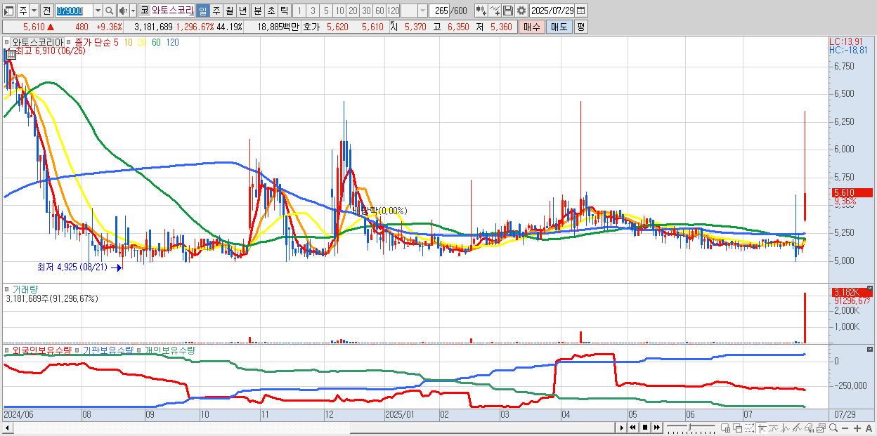 - 와토스코리아 (5,610원 ▲ 9.36% , 시총: 404억, 거래량: 3,181,689, 거래대금:189억)