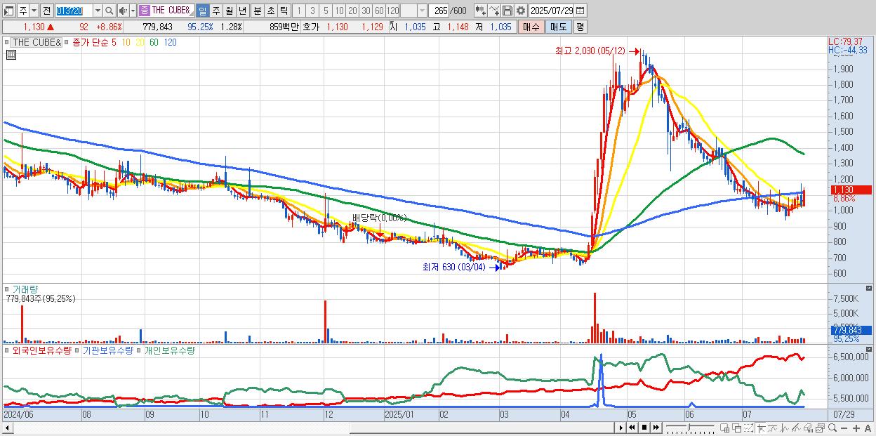 - THE CUBE& (1,130원 ▲ 8.86% , 시총: 687억, 거래량: 779,843, 거래대금:9억)