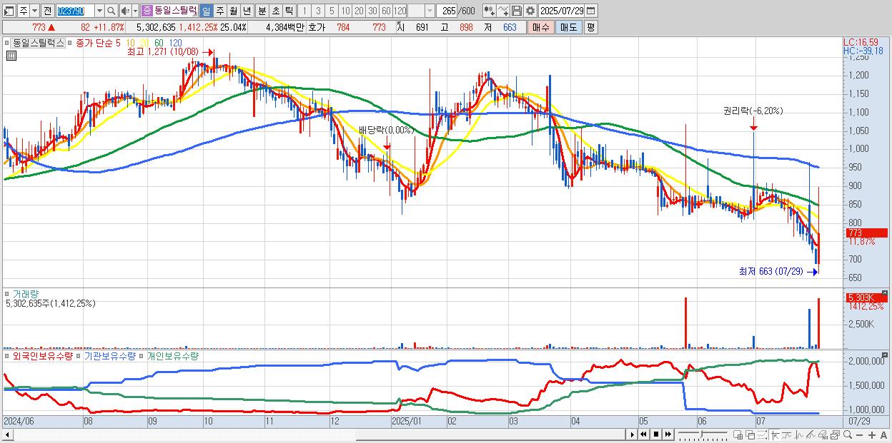 - 동일스틸럭스 (773원 ▲ 11.87% , 시총: 164억, 거래량: 5,302,635, 거래대금:44억)
