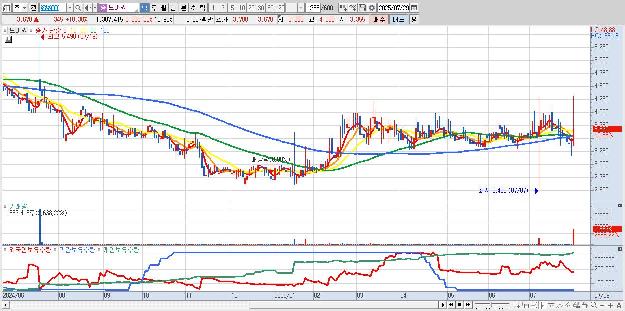 - 브이씨 (3,670원 ▲ 10.38% , 시총: 268억, 거래량: 1,387,415, 거래대금:56억)