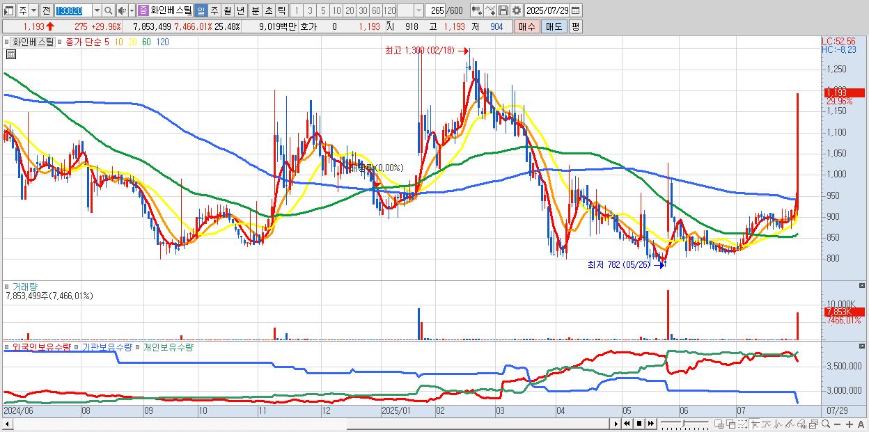 - 화인베스틸 (1,193원 ▲ 29.96% , 시총: 368억, 거래량: 7,853,499, 거래대금:90억)