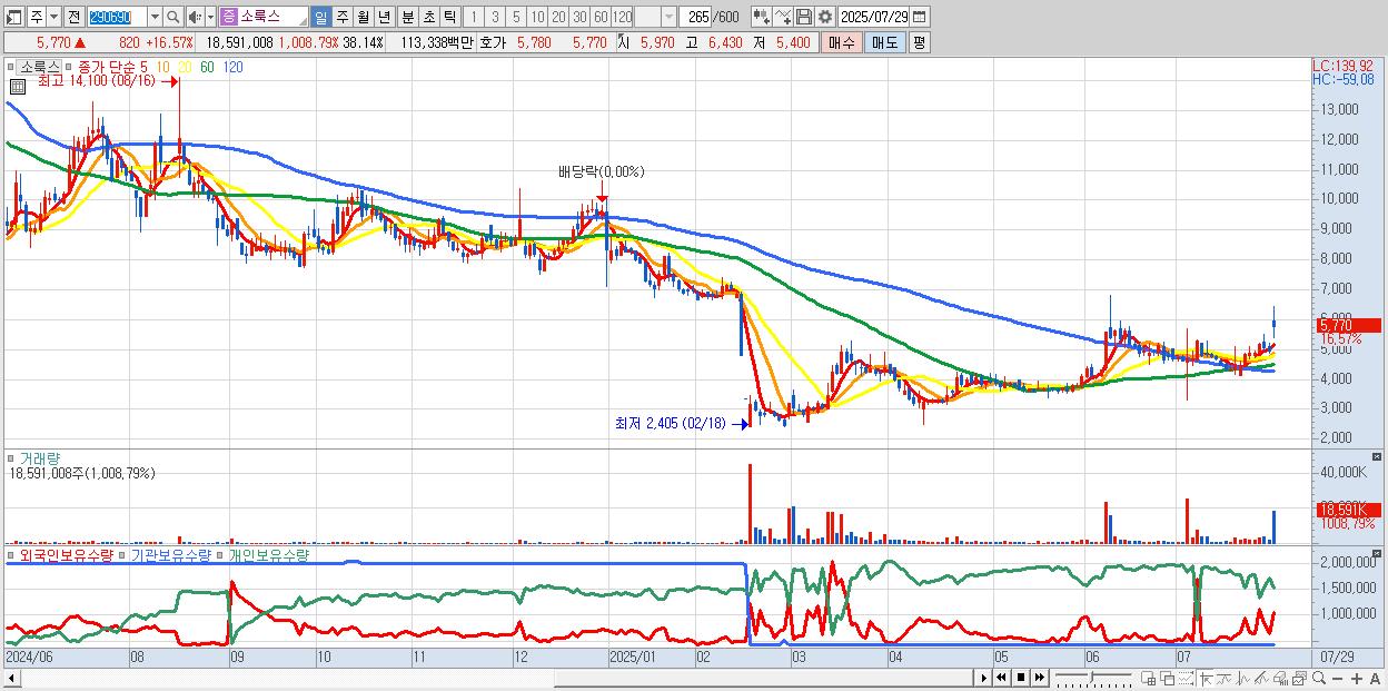- 소룩스 (5,770원 ▲ 16.57% , 시총: 2,812억, 거래량: 18,591,008, 거래대금:1,133억)