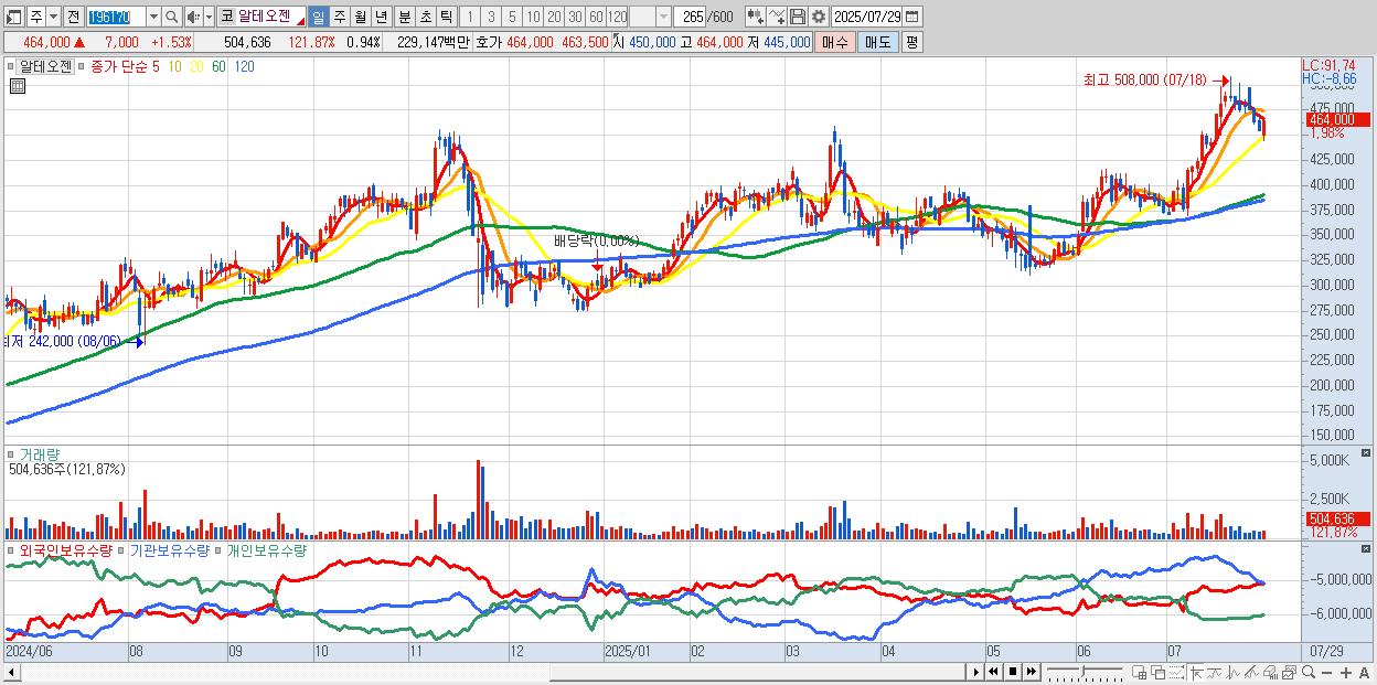 - 알테오젠 (456,500원 ▼ -0.11% , 시총: 244,068억, 거래량: 290,753, 거래대금:1,318억)