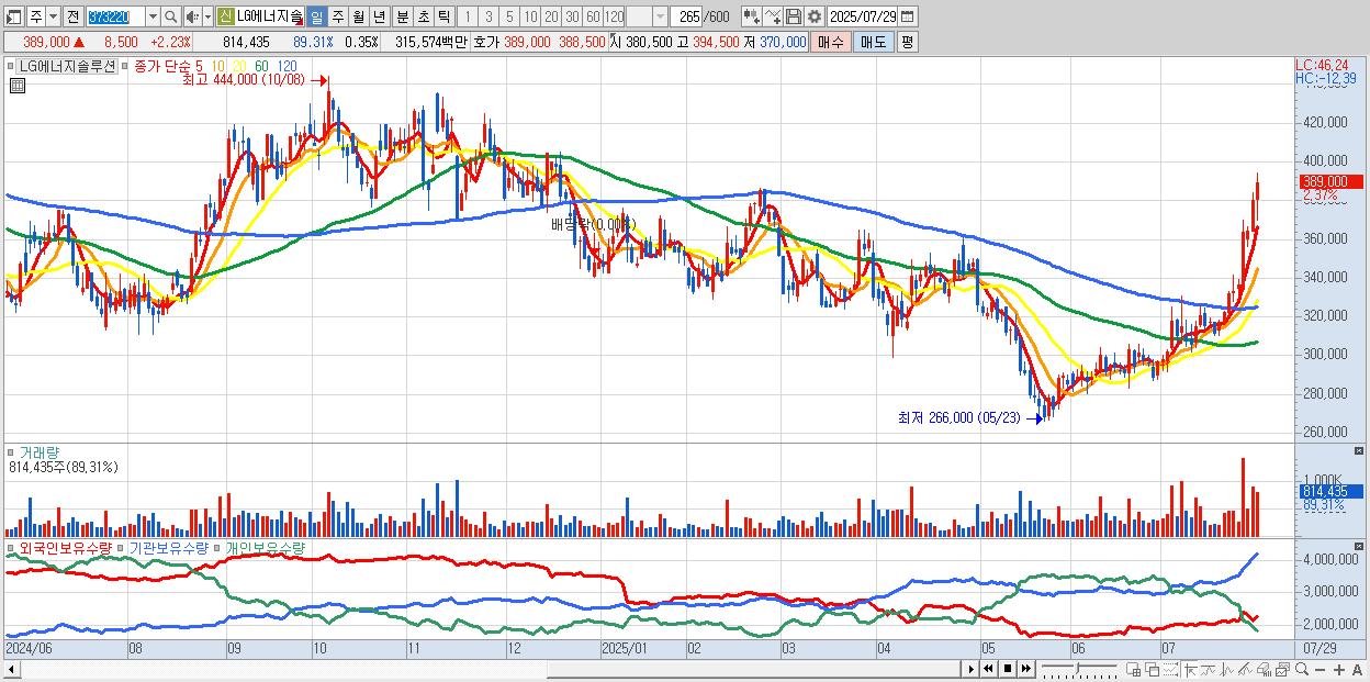 - LG에너지솔루션 (392,000원 ▲ 3.02% , 시총: 917,280억, 거래량: 623,554, 거래대금:2,419억)