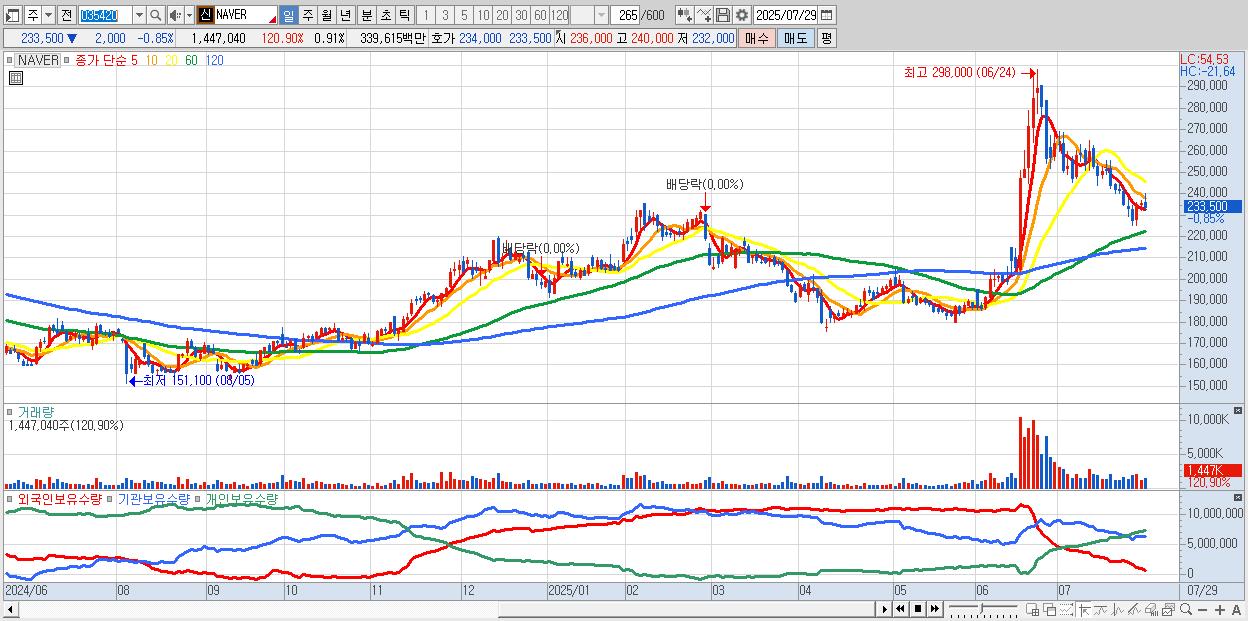 - NAVER (233,000원 ▼ -1.06% , 시총: 369,158억, 거래량: 928,345, 거래대금:2,177억)