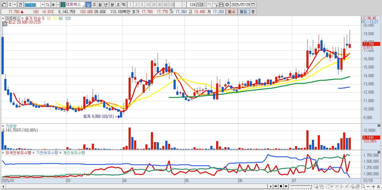 - 미트박스 (17,780원 ▲ 0.91% , 시총: 997억, 거래량: 6,143,759, 거래대금:1,132억)