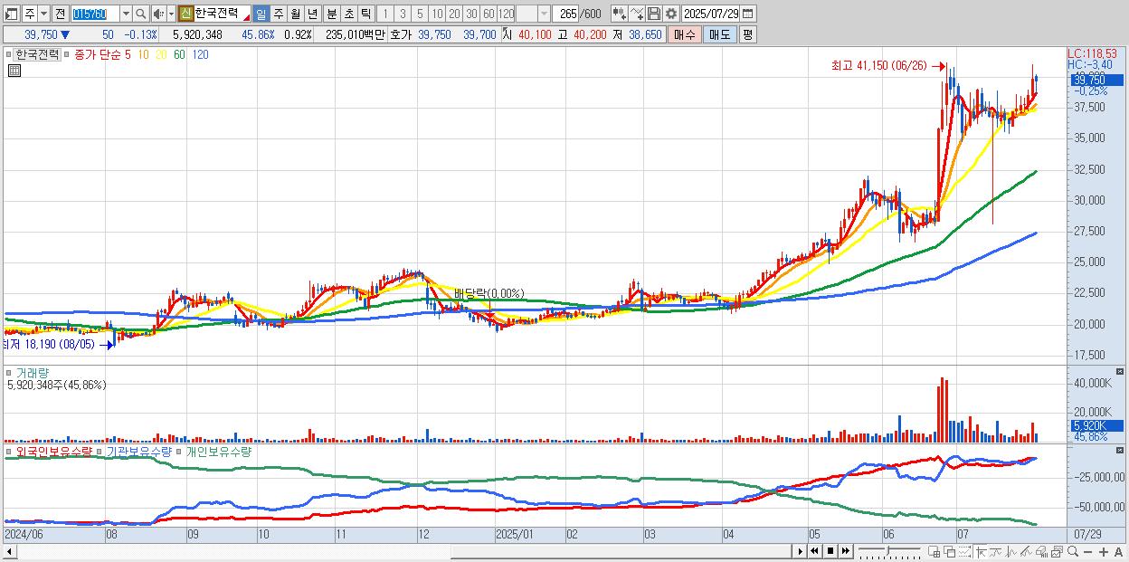 - 한국전력 (39,700원 ▼ -0.25% , 시총: 254,860억, 거래량: 3,803,998, 거래대금:1,510억)