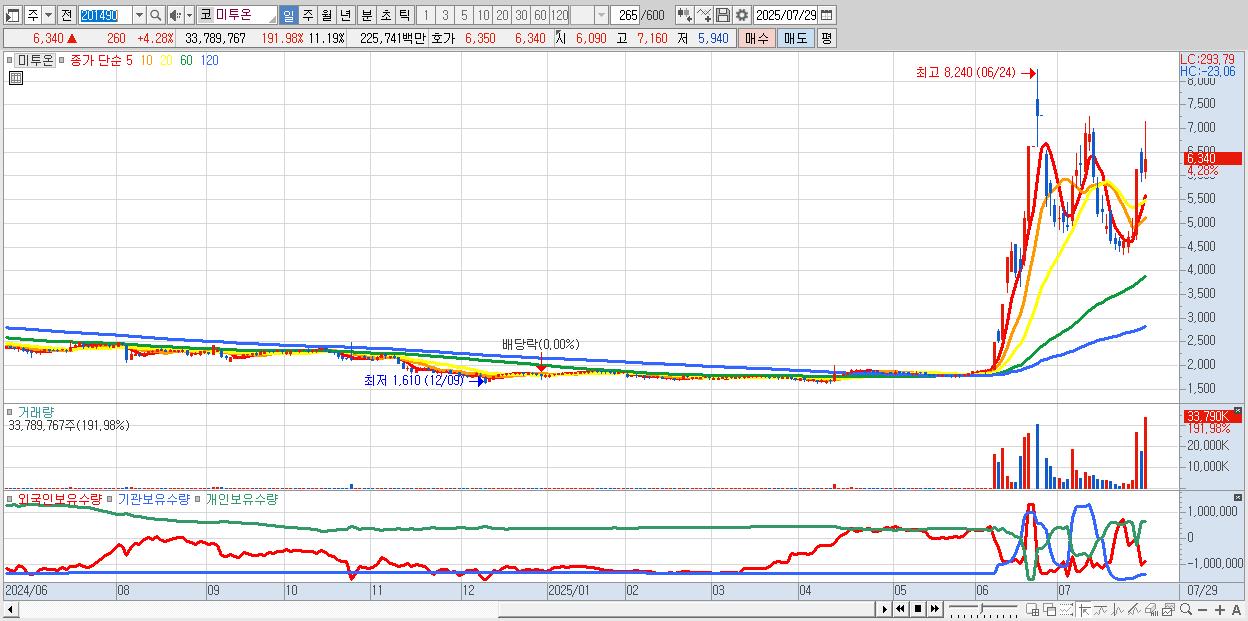 - 미투온 (6,340원 ▲ 4.28% , 시총: 1,927억, 거래량: 33,789,767, 거래대금:2,257억)