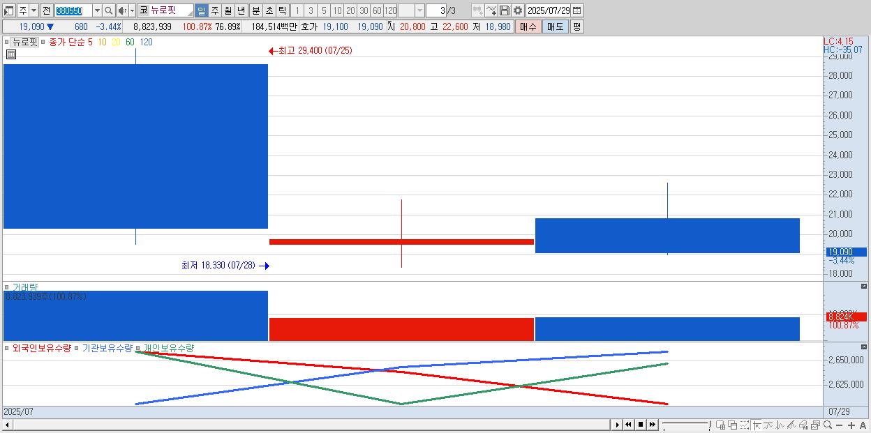 - 뉴로핏 (19,090원 ▼ -3.44% , 시총: 2,191억, 거래량: 8,823,939, 거래대금:1,845억)