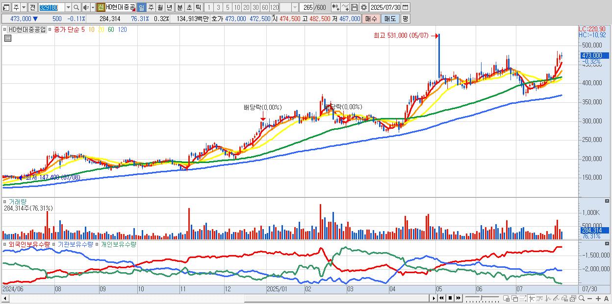 - HD현대중공업 (471,000원 ▼ -0.53% , 시총: 418,121억, 외국인 순매수 거래금:79억)