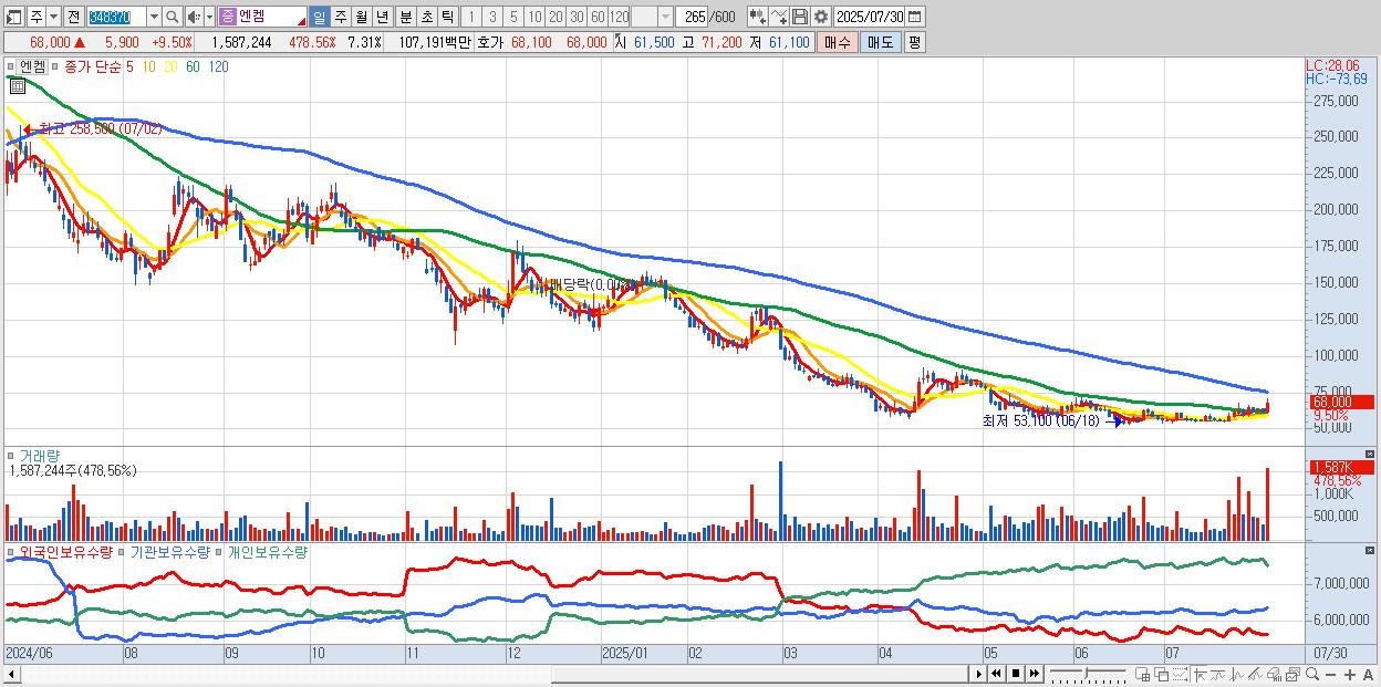 - 엔켐 (66,900원 ▲ 7.73% , 시총: 14,534억, 외국인 순매수 거래금:117억)
