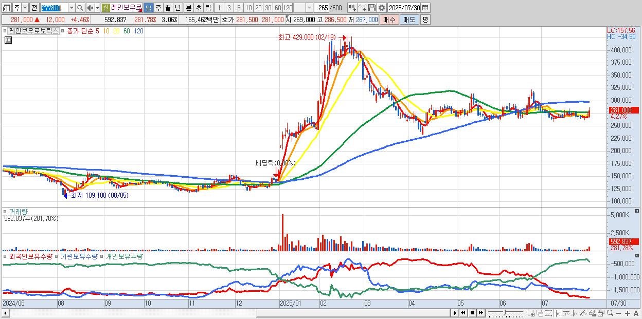 - 레인보우로보틱스 (281,000원 ▲ 4.46% , 시총: 54,514억, 외국인 순매수 거래금:261억)