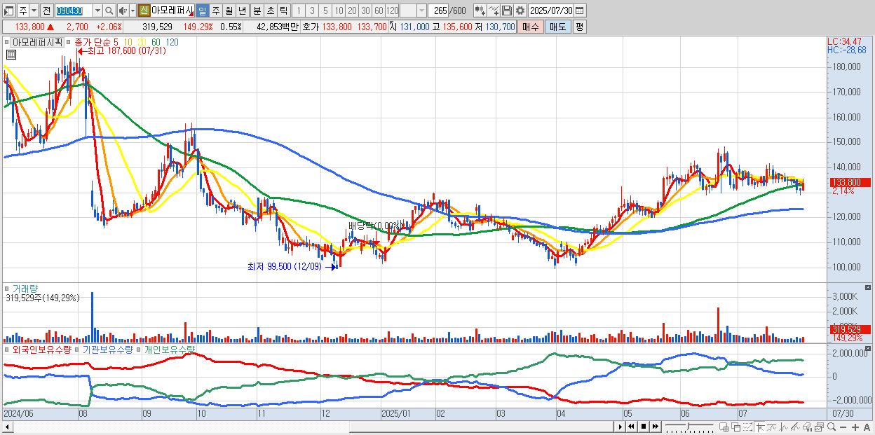 - 아모레퍼시픽 (133,600원 ▲ 1.91% , 시총: 78,146억, 외국인 순매수 거래금:90억)