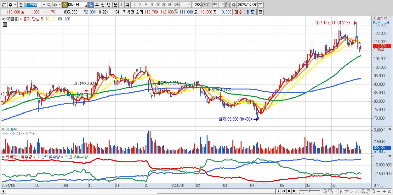 - KB금융 (112,800원 ▲ 1.35% , 시총: 430,289억, 외국인 순매수 거래금:83억)