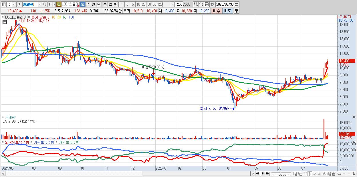 30.LG디스플레이 10,520원 ▲ 1.64% (KOSPI, 034220)