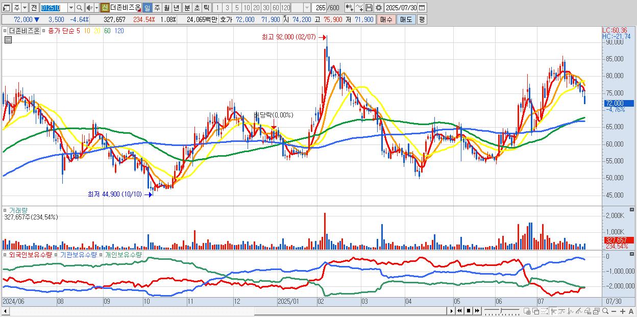 - 더존비즈온 (72,500원 ▼ -3.97% , 시총: 22,028억, 외국인 순매수 거래금:73억)