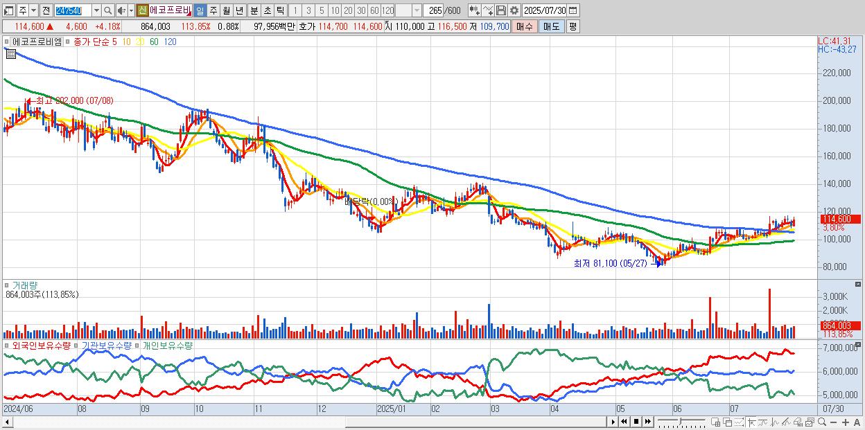 - 에코프로비엠 (114,400원 ▲ 4% , 시총: 111,885억, 외국인 순매수 거래금:81억)