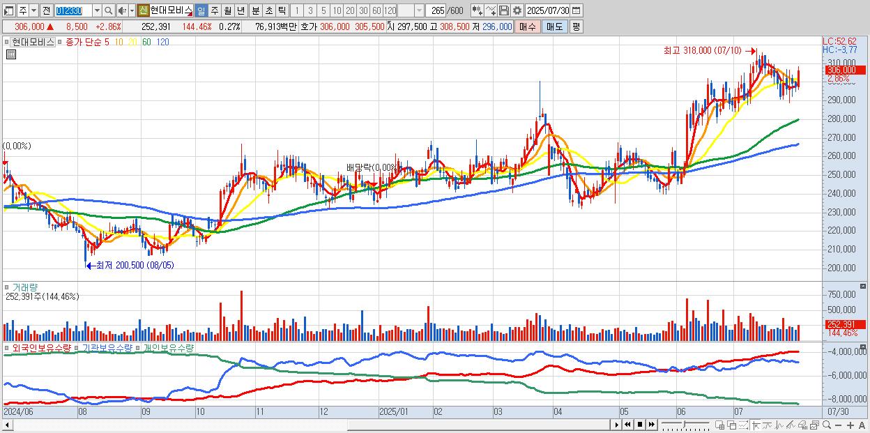 - 현대모비스 (306,500원 ▲ 3.03% , 시총: 281,352억, 외국인 순매수 거래금:148억)