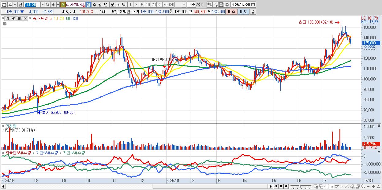 - 리가켐바이오 (134,800원 ▼ -3.02% , 시총: 49,351억, 외국인 순매수 거래금:89억)