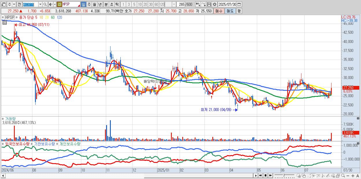 - HPSP (27,100원 ▲ 6.07% , 시총: 22,628억, 외국인 순매수 거래금:119억)