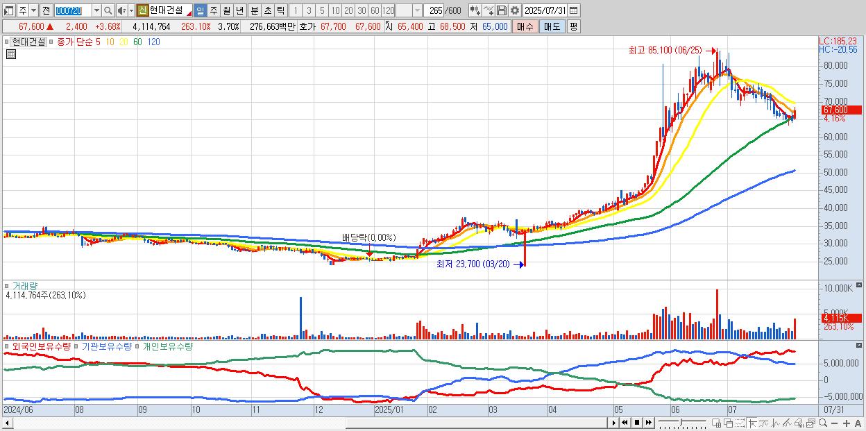 - 현대건설 (67,500원 ▲ 3.53% , 시총: 75,165억, 거래량: 3,239,951, 거래대금:2,181억)