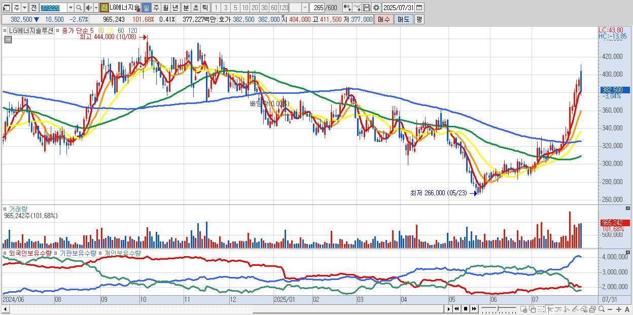 - LG에너지솔루션 (382,500원 ▼ -2.67% , 시총: 895,050억, 거래량: 694,580, 거래대금:2,706억)