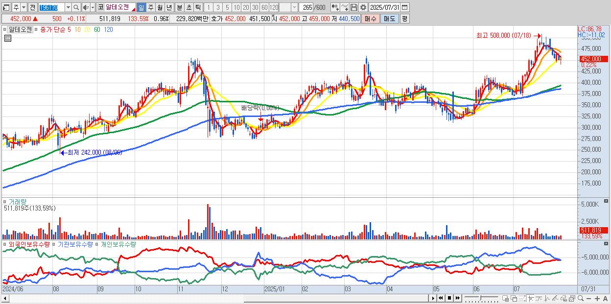 - 알테오젠 (454,000원 ▲ 0.55% , 시총: 242,731억, 거래량: 316,316, 거래대금:1,420억)