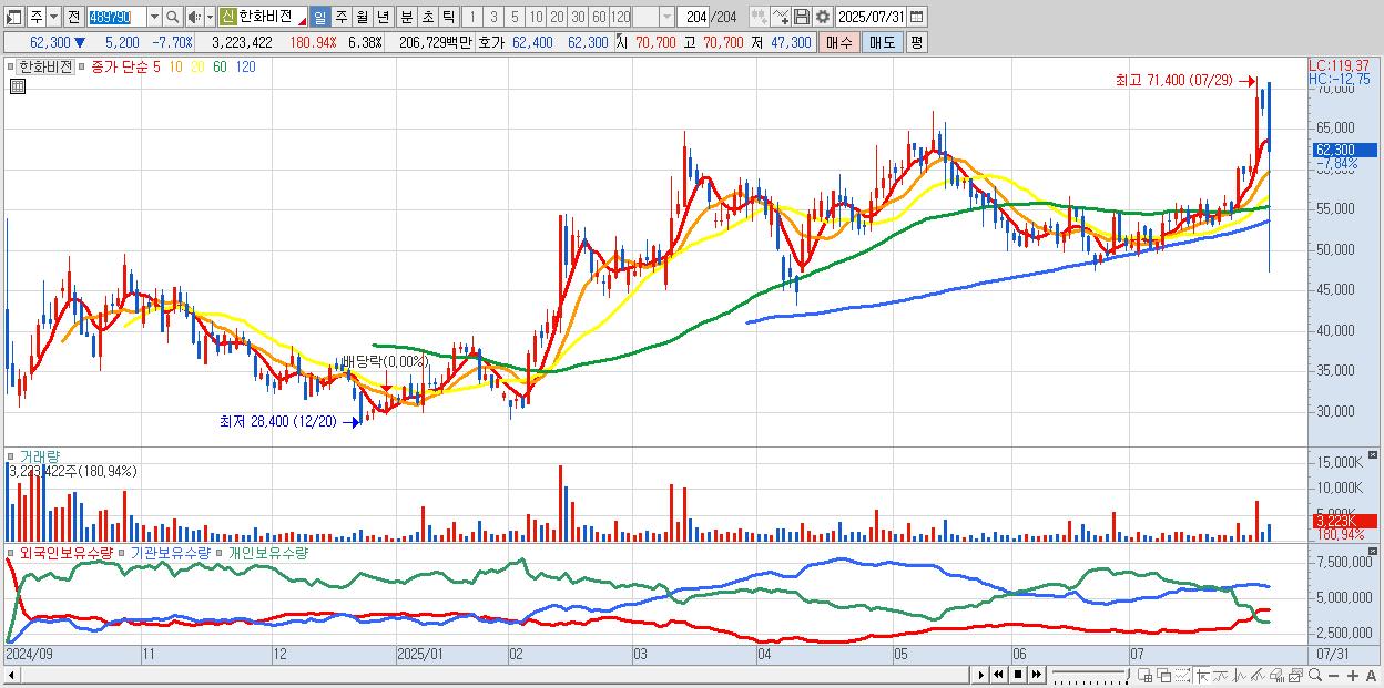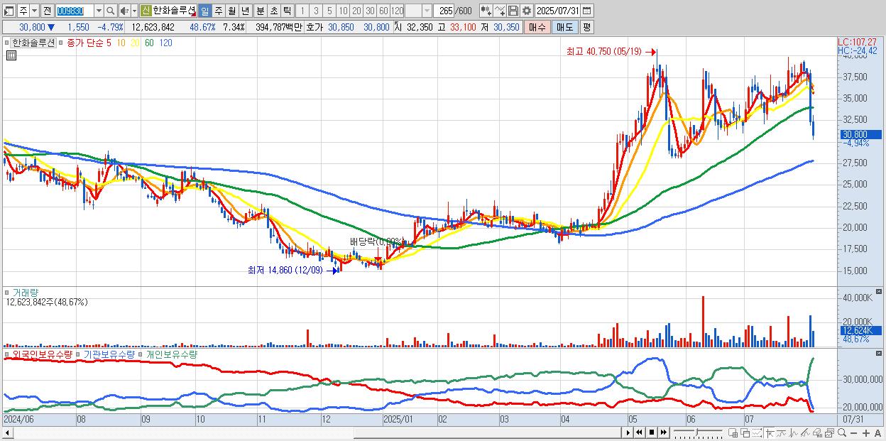 - 한화솔루션 (30,700원 ▼ -5.1% , 시총: 52,771억, 거래량: 5,953,270, 거래대금:1,849억)