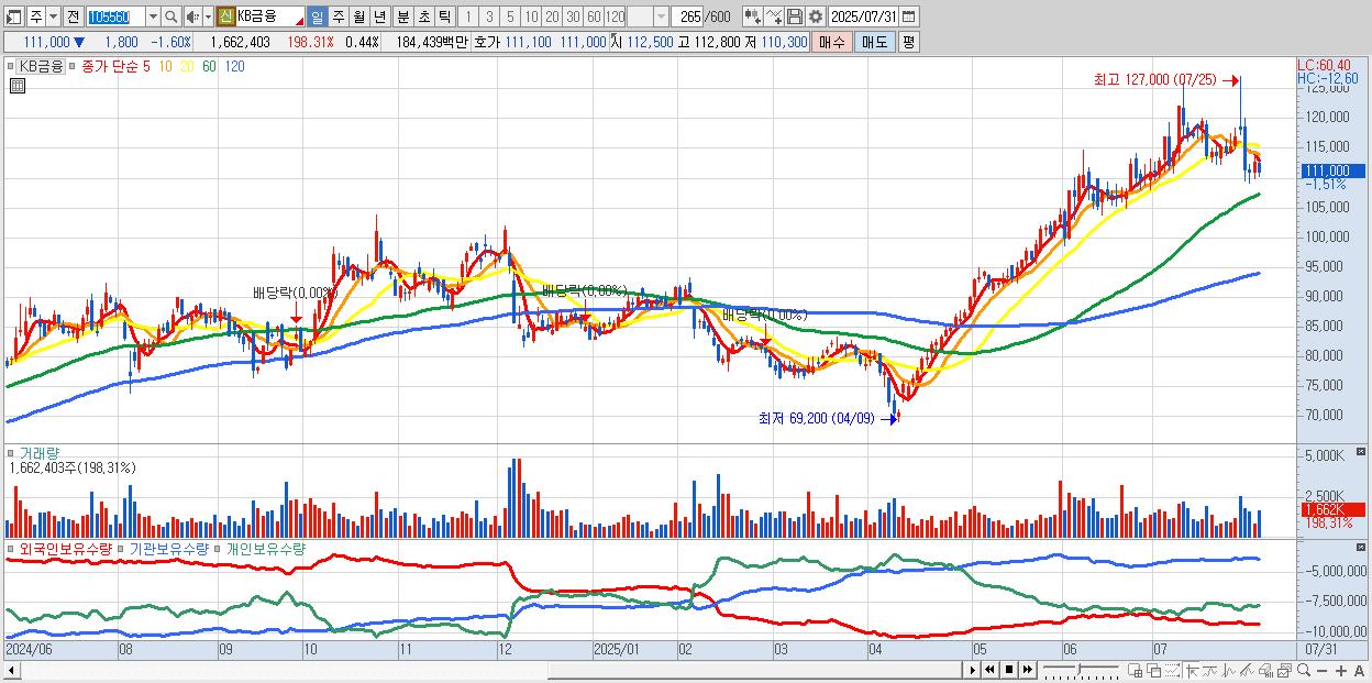 - KB금융 (110,900원 ▼ -1.68% , 시총: 423,041억, 거래량: 1,564,300, 거래대금:1,735억)