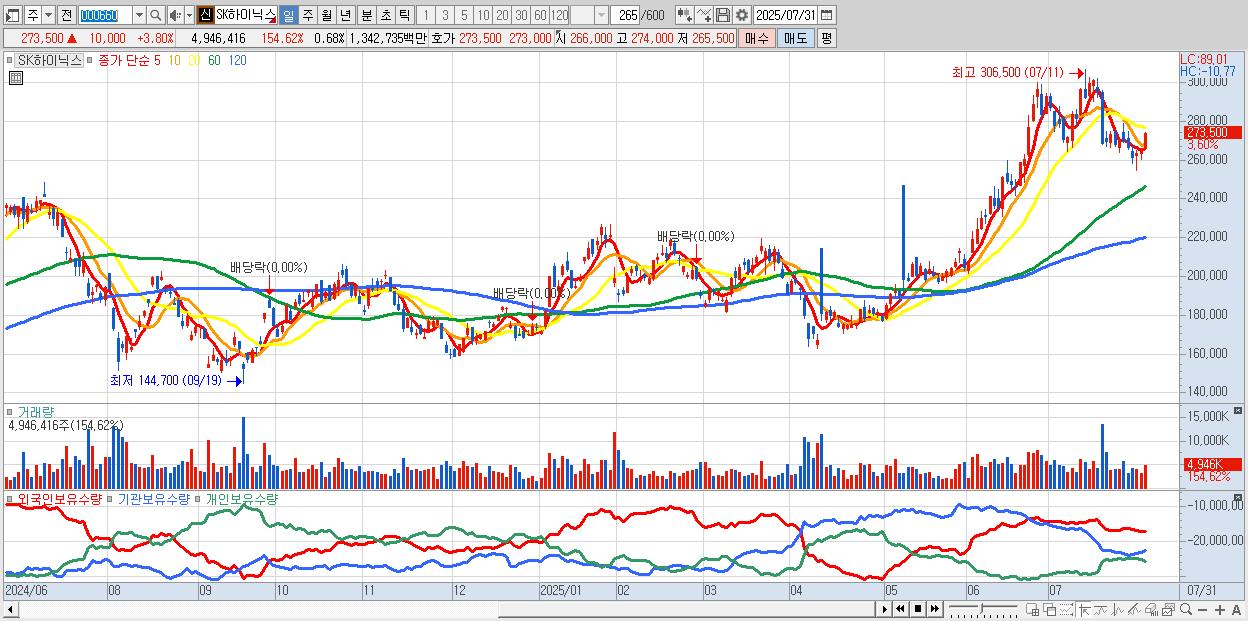 - SK하이닉스 (273,500원 ▲ 3.8% , 시총: 1,991,086억, 거래량: 3,472,644, 거래대금:9,435억)