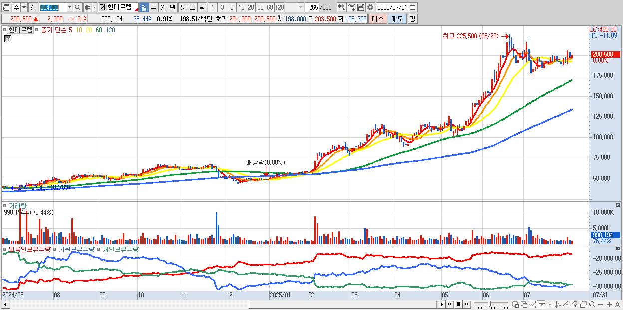 - 현대로템 (202,000원 ▲ 1.76% , 시총: 220,467억, 거래량: 607,991, 거래대금:1,220억)