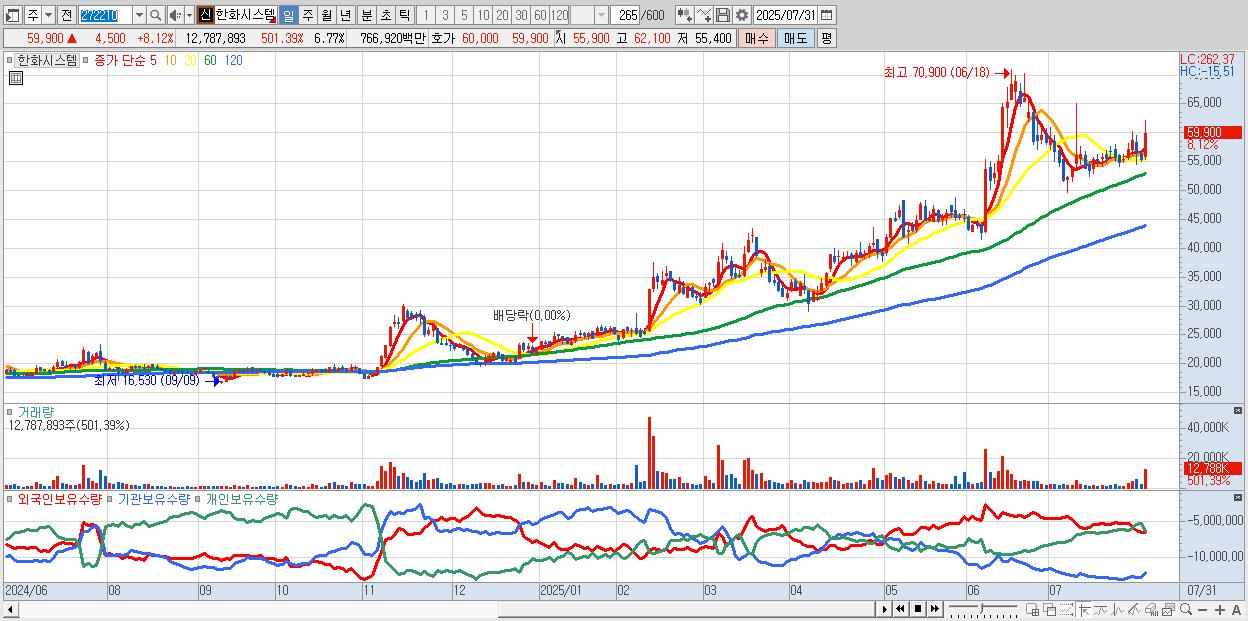 - 한화시스템 (59,400원 ▲ 7.22% , 시총: 112,218억, 거래량: 6,806,848, 거래대금:4,086억)