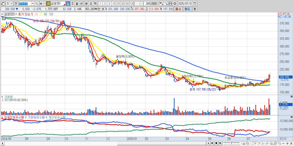 - 삼성SDI (201,000원 ▼ -2.43% , 시총: 161,977억, 거래량: 948,283, 거래대금:1,931억)
