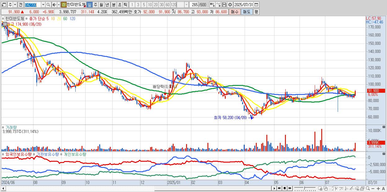 - 한미반도체 (91,900원 ▲ 6.98% , 시총: 87,592억, 거래량: 2,082,871, 거래대금:1,889억)