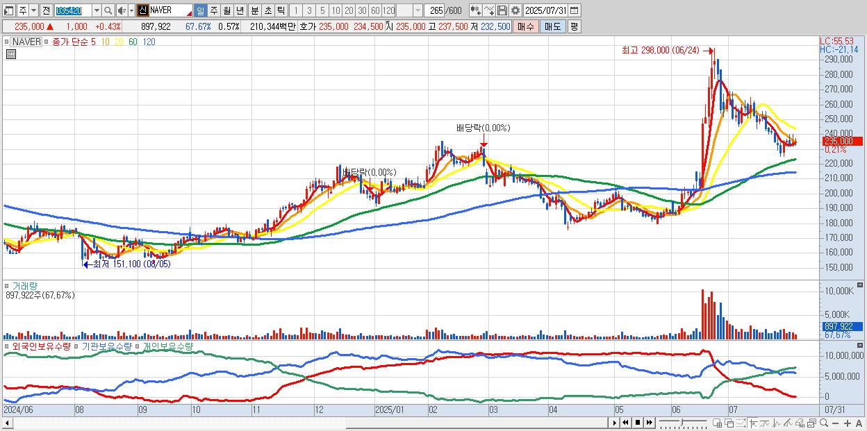 - NAVER (235,000원 ▲ 0.43% , 시총: 372,327억, 거래량: 521,064, 거래대금:1,220억)