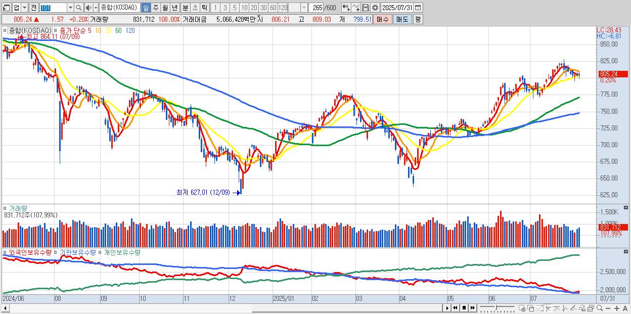 | 07/25 | 806.95 | ▼-0.36% | 735억 | 928억 | -1,402억 | -261억 |
