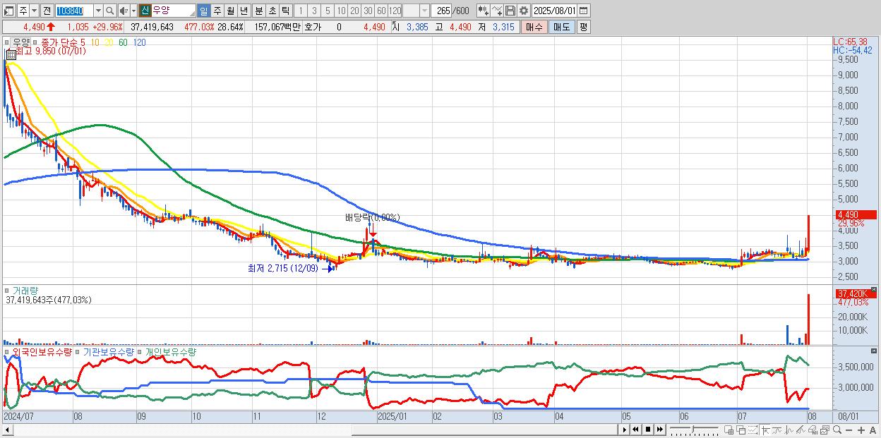 - 우양 (4,490원 ▲ 29.96% , 시총: 735억, 거래량: 37,419,643, 거래대금:1,571억)