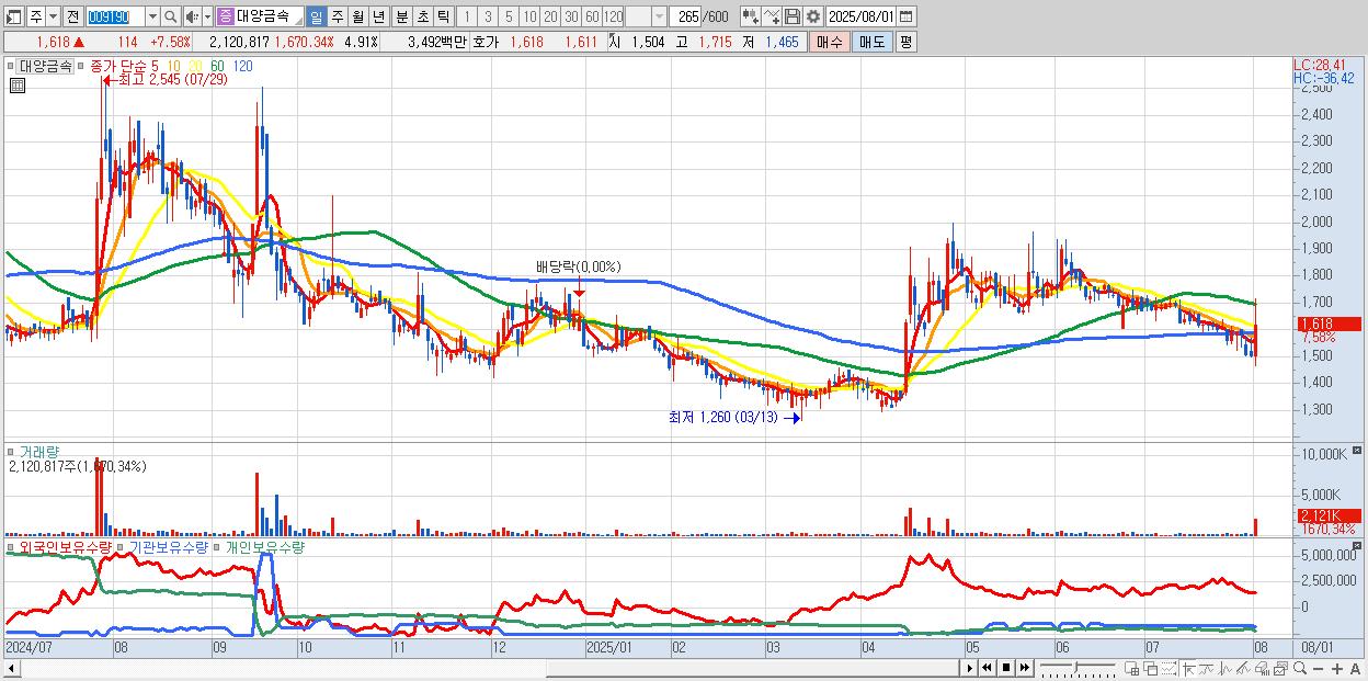- 대양금속 (1,618원 ▲ 7.58% , 시총: 699억, 거래량: 2,120,817, 거래대금:35억)