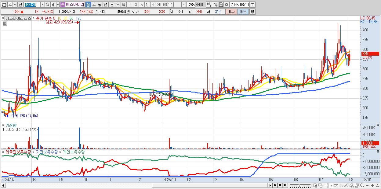 - 에스아이리소스 (339원 ▲ 5.61% , 시총: 243억, 거래량: 1,366,213, 거래대금:5억)