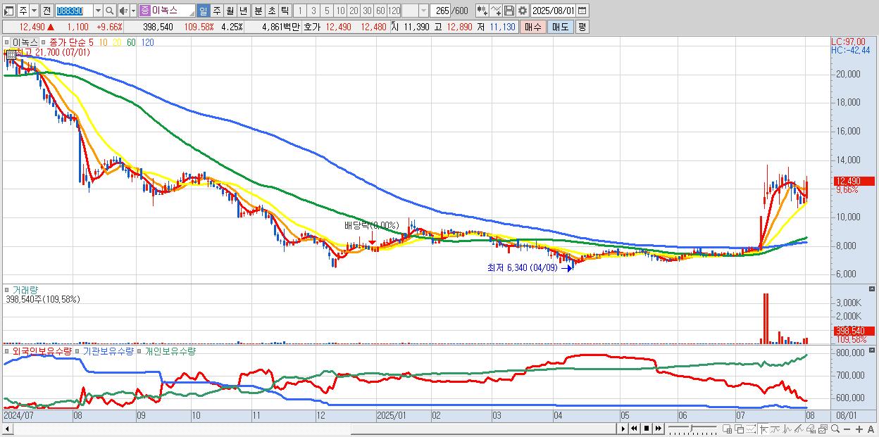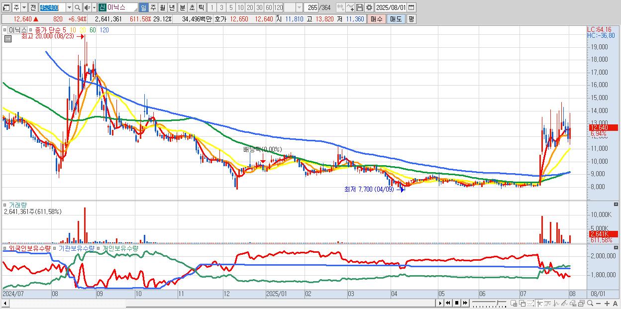 - 이닉스 (12,640원 ▲ 6.94% , 시총: 1,147억, 거래량: 2,641,361, 거래대금:345억)