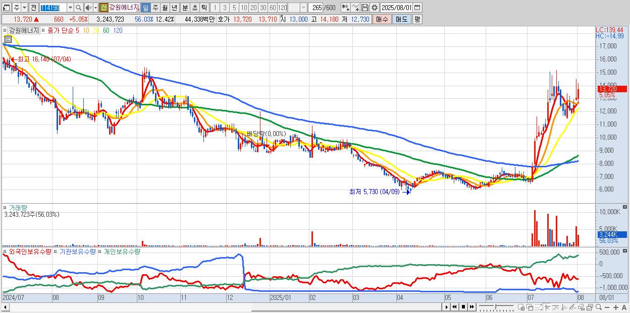 - 강원에너지 (13,720원 ▲ 5.05% , 시총: 3,584억, 거래량: 3,243,723, 거래대금:443억)