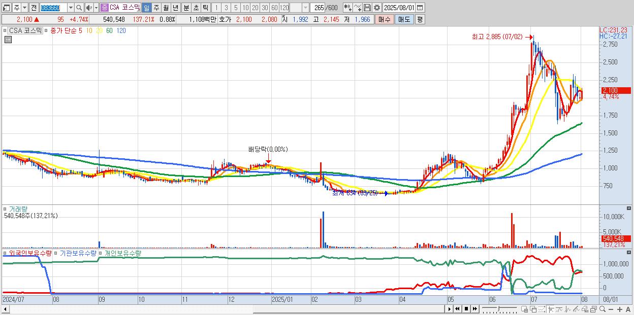 - CSA 코스믹 (2,100원 ▲ 4.74% , 시총: 1,286억, 거래량: 540,548, 거래대금:11억)