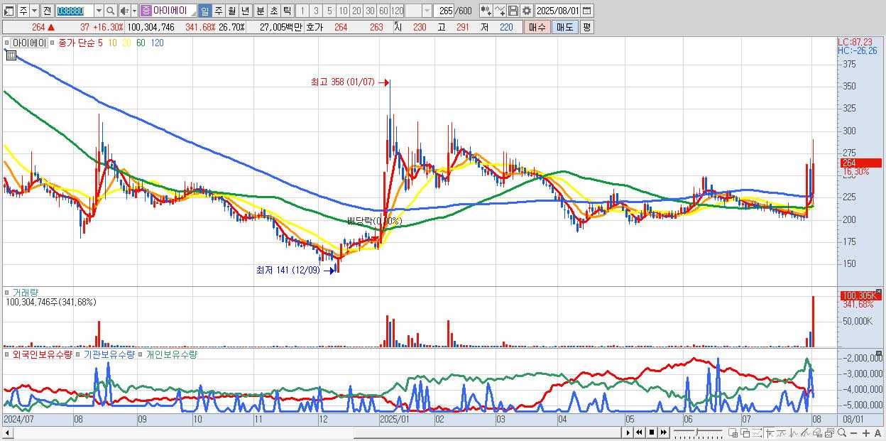 - 아이에이 (264원 ▲ 16.3% , 시총: 992억, 거래량: 100,304,746, 거래대금:270억)