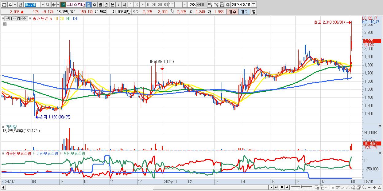 - 코데즈컴바인 (2,095원 ▲ 9.17% , 시총: 793억, 거래량: 18,755,940, 거래대금:410억)